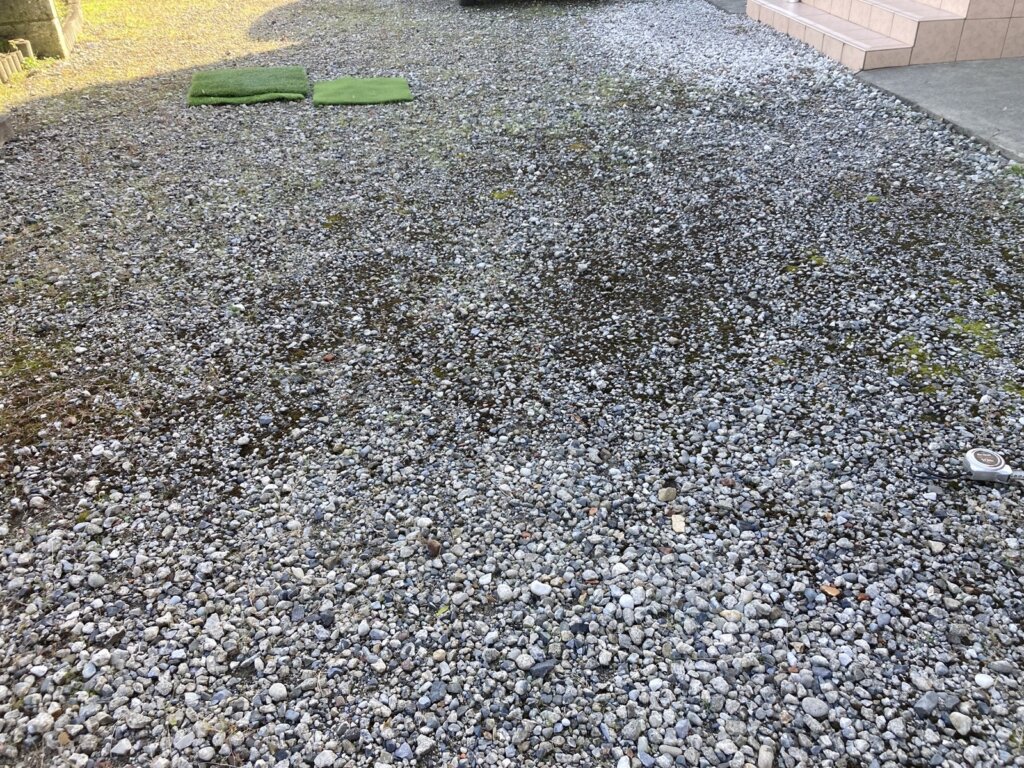 今回の施工は、砂利撤去、山砂入れ、整地・転圧、防草シート・人工芝施工という内容でした。